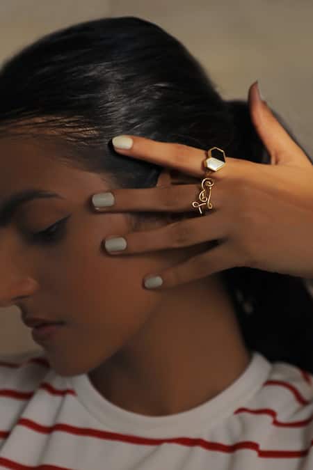 Gold colorblock heart ring featuring studded white mother of pearl and black onyx