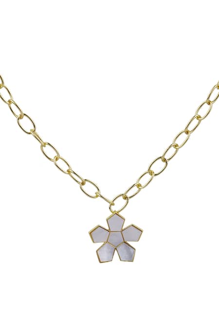 Gold interlinked necklace featuring a floral motif with mother of pearl embellishments
