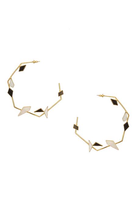 Gold oversized hoops featuring geometric motifs adorned with white mother of pearl and black onyx gemstones