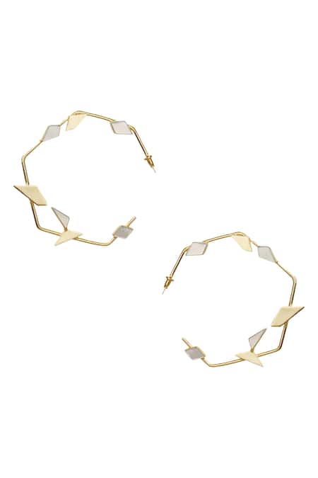 Gold oversized hoops featuring geometric motifs adorned with white mother of pearls