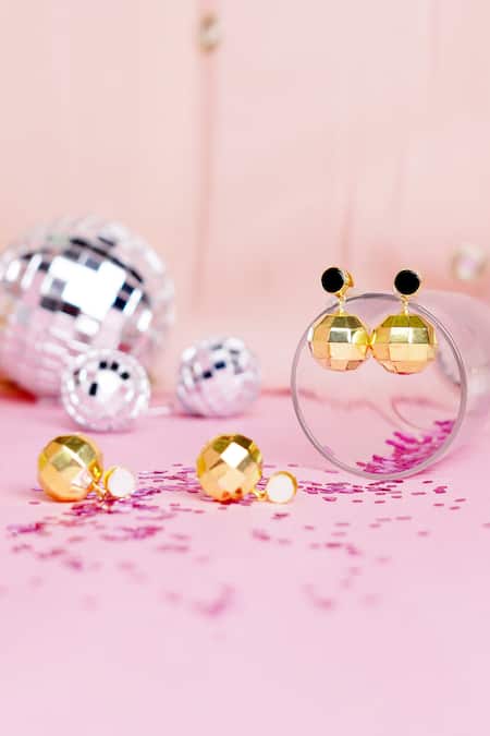 Gold earrings featuring a disco ball textured design with white mother of pearl embellishment