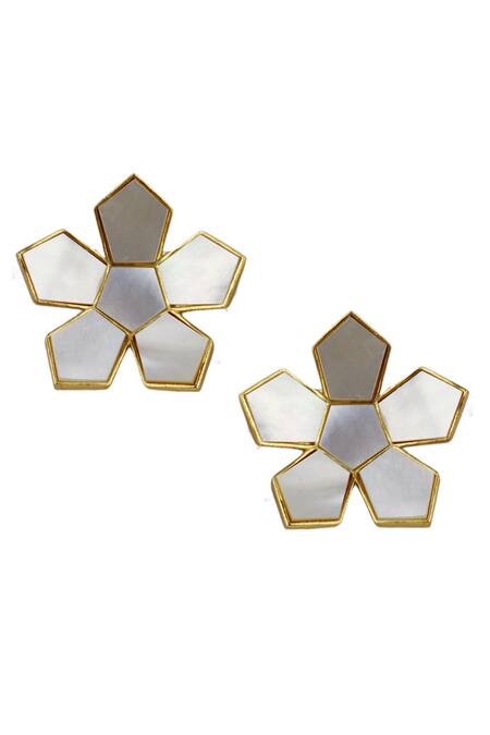 Gold stud earrings featuring a floral motif pattern with mother of pearl embellishments