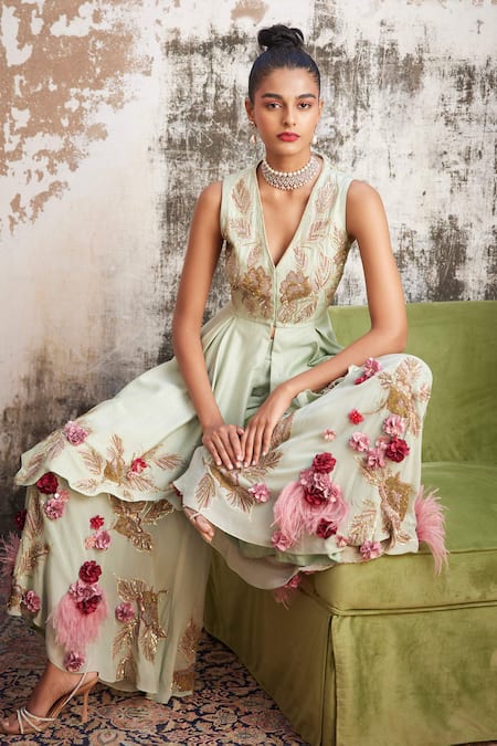 Mint green asymmetric tunic featuring a V neck and sleeveless design, embellished with sequins and 3D flowers. Paired with matching sharara, adorned with similar floral patterns and sequin details.