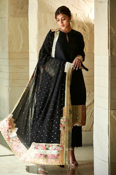Black chanderi kurta enhanced with patchwork embroidered panel & cutwork hemline. Paired with black chanderi trousers and a georgette dupatta accentuated with mukaish, lace and patchwork border.