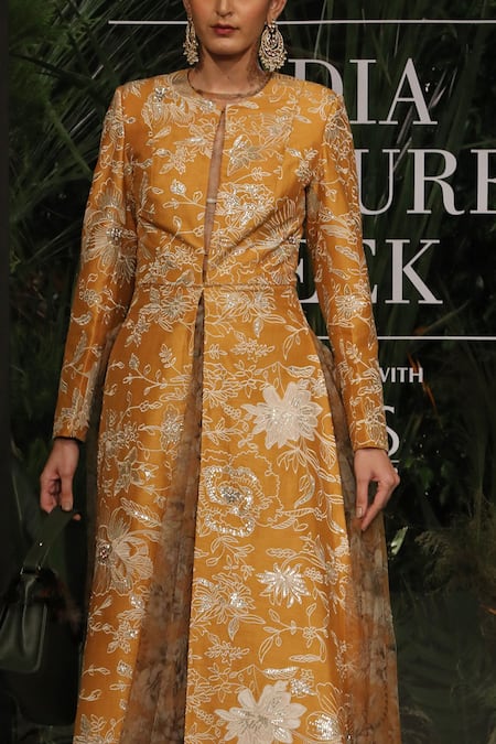 Mustard anarkali jacket enhanced with embroidery all-over. Paired with a floral printed gathered dress.
