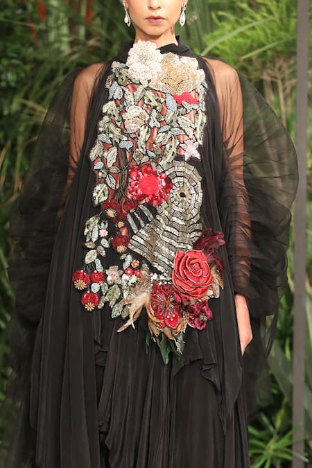 Black layered gown with tulle sleeves and floral embroidered corsages placed at the front and back.