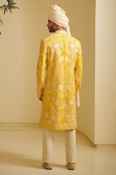 Yellow sherwani with floral motif resham thread embroidery. Comes with ivory silk pants.