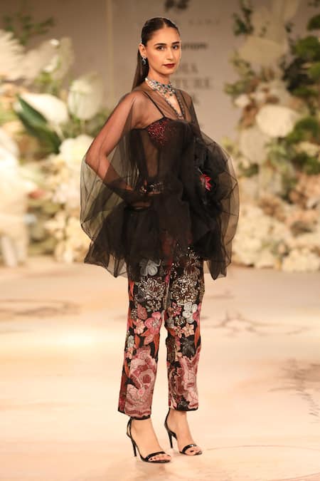 Buy_Varun Bahl_Black Chanderi Silk, Net Embroidery, Sequins Floral Bloom Jumpsuit With Cape _at_Aza_Fashions