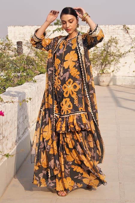 Grey kurta featuring floral prints with sequin and resham embroidery. Paired with a matching cape overlay and tiered sharara.