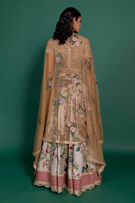 Beige lehenga featuring all-over floral prints with intricate hand embroidery. Paired with an organza padded blouse and an embroidered net dupatta.