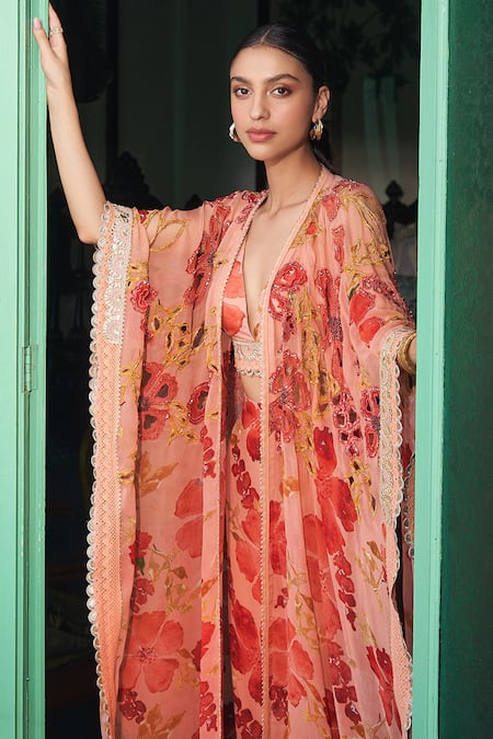 Peach long cape featuring all-over floral prints with intricate cutwork and delicate sequin and bead embroidery. Paired with a matching sleeveless bustier and high-waisted tiered sharara.