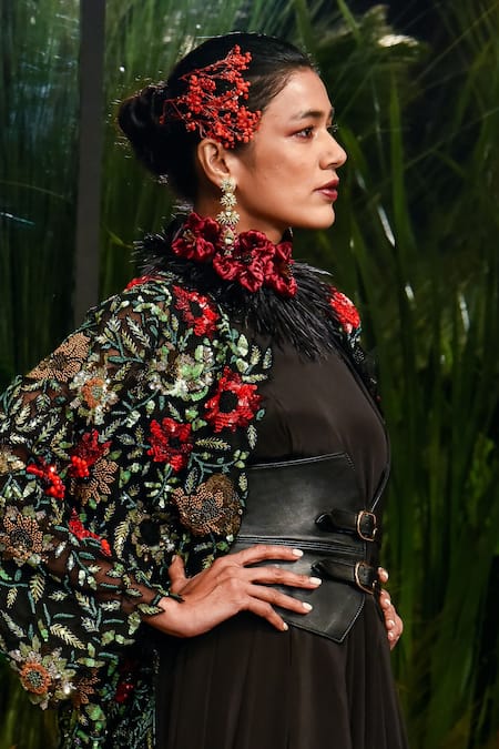 Buy_Varun Bahl_Black Tulle, Viscose Crepe Floral Jacket Open Layered Dress With Embroidered _at_Aza_Fashions