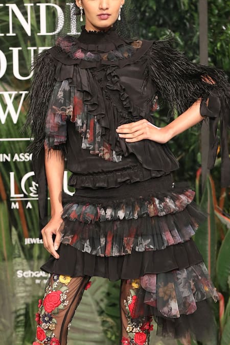 Black layered ruffle dress accentuated with black tonal feathers & floral print.