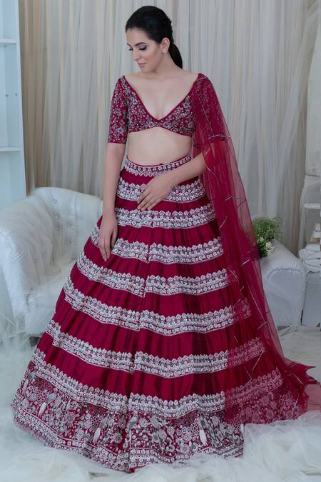 Buy_Varun Chakkilam_Maroon Top Silk Skirt Silk Dupatta Embroidered Bridal Lehenga Set_at_Aza_Fashions