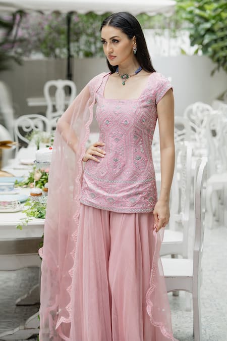Flamingo pink short kurta with bead embellishment in floral motifs and cap sleeves. Comes with palazzo and dupatta.