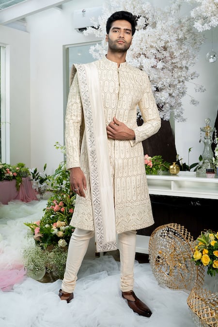 Ivory sherwani with floral zardozi embroidery and band collar. Comes with churidar and stole.