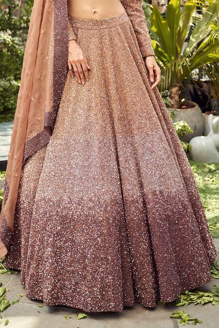 Brown ombre lehenga featuring all over sequins and cutdana beaded embroidery. Paired with a padded blouse and dupatta with contrast border embroidery.