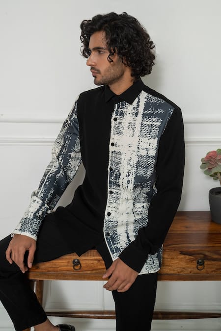 Charcoal black cotton shirt in a distressed pattern prints on half side & one sided sleeve.
