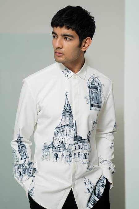 White full sleeve shirt featuring vintage monument placement print and a spread collar