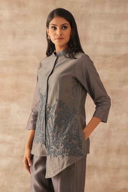 Grey tunic featuring cutdana and dori embroidery with a band collar and three-quarter sleeves. Paired with matching pants for a complete look.