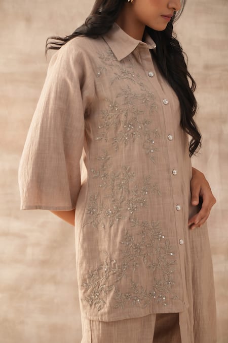 Grey tunic featuring a collared neckline, three-quarter sleeves, and embroidered detailing with thread and sequins. Paired with matching pants that complement the tunic's design.