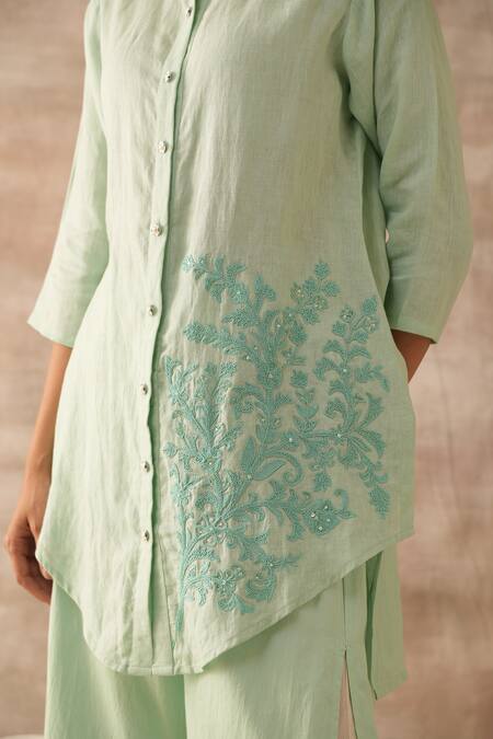 Sea green tunic featuring floral dori work on one side and button closure. Paired with embroidered pant for a coordinated look.