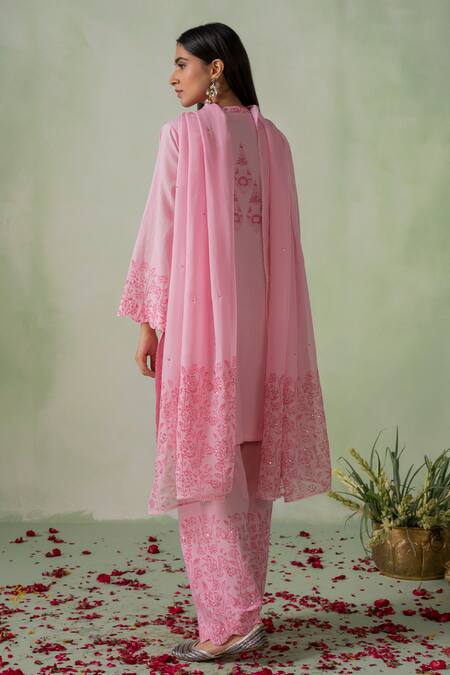 Pink kurta featuring tonal rose block print with thread, bead, and sequins embroidery. Paired with scalloped hem palazzo and organza dupatta with gota lace detailing.