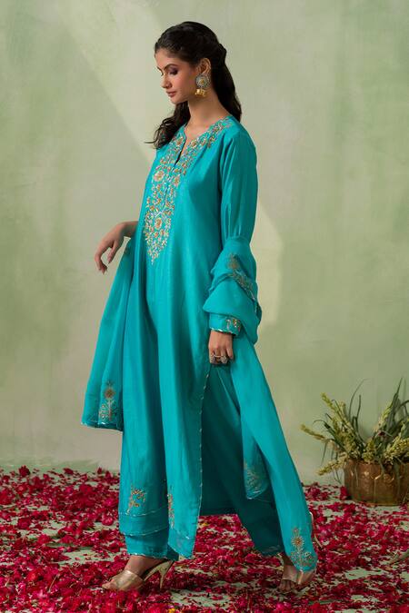 Turquoise kurta featuring notched neckline, long sleeves, and floral zari, sequin, thread embroidery. Paired with a matching pant and border embroidered organza dupatta.