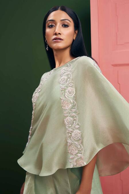 Green Tissue Silk Embroidered Silver Zardozi Cape Floral Pant Set