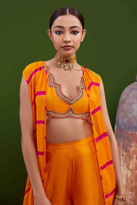 Orange and pink silk organza jacket featuring gota embroidery. Paired with a silk blouse and kali palazzo.