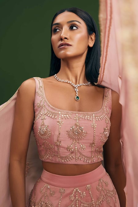 Blush pink lehenga featuring intricate zardozi, dori, and sequin embroidery. Accompanied by a matching blouse and a silk organza dupatta with sequin work.