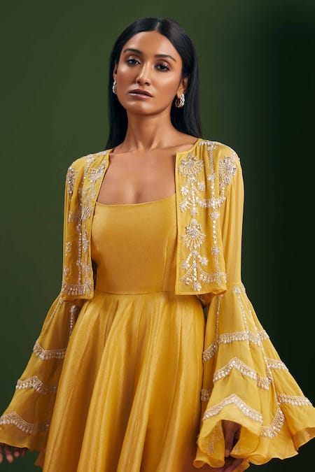 Lemon yellow anarkali kurta with strappy sleeves and a flared silhouette. Paired with a sheer embroidered jacket featuring silver zardozi and dori work embellishments.