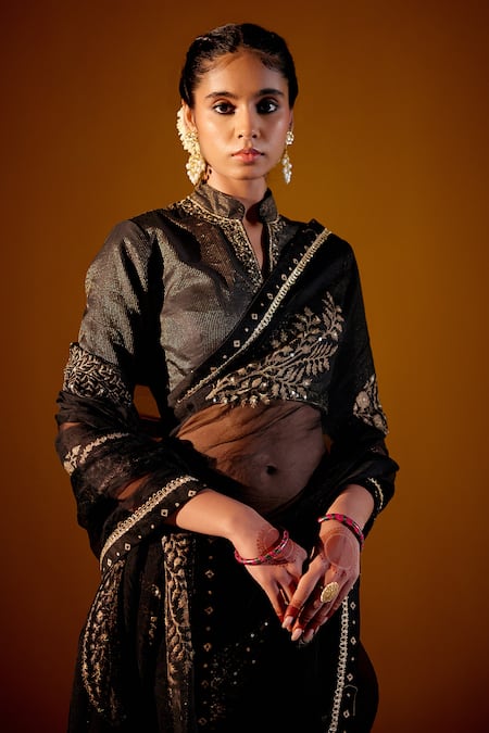 Black Silk Organza Printed Resham Stand Collar V Embroidered Saree And Blouse