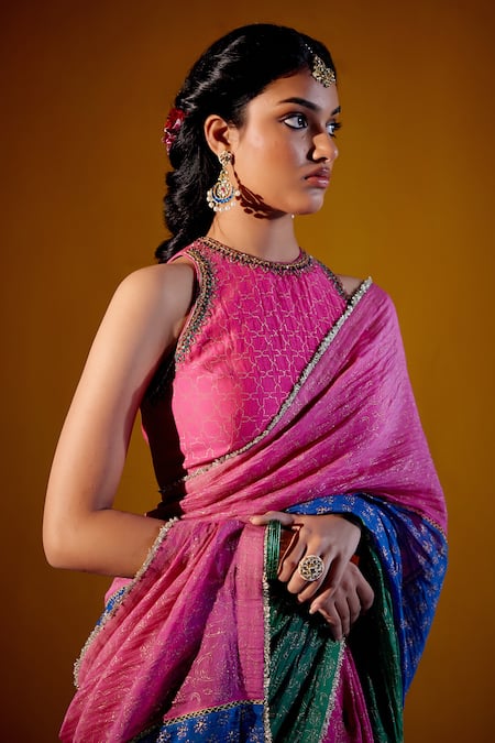 Multicolor handloom chanderi mul saree featuring block prints and embroidered detailing. Paired with a halter neck padded blouse adorned with sequin and zari work.