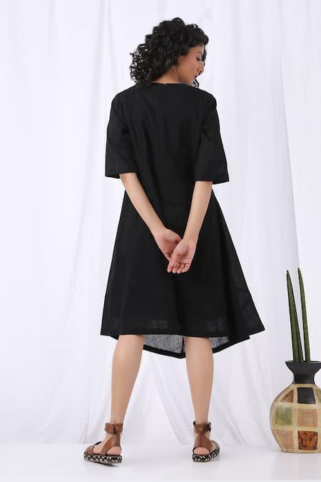 Black midi dress featuring a round neckline and half sleeves with a front knot detail