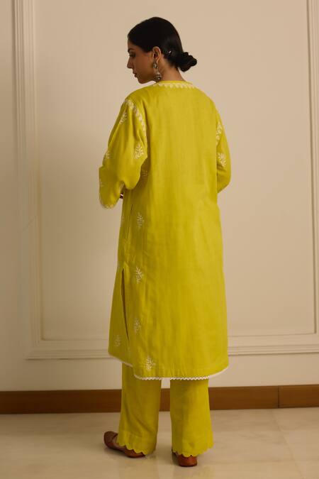 Yellow kurta featuring thread placement embroidery in floral pattern on the placket
