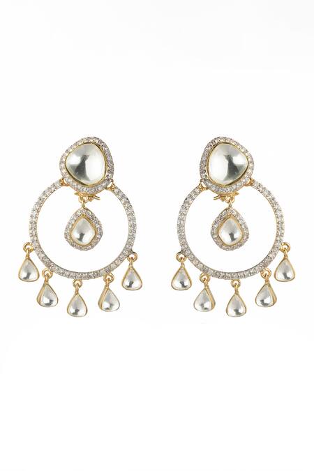 Embellished with artificial kundan stones, CZ stone detailing, Circular hoop design with hanging drops