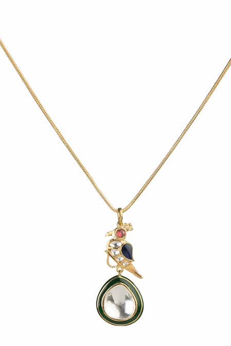 Gold toned chain necklace featuring a studded parrot and drop motif pendant. Adorned with artificial kundan and rhodolite embellishments.