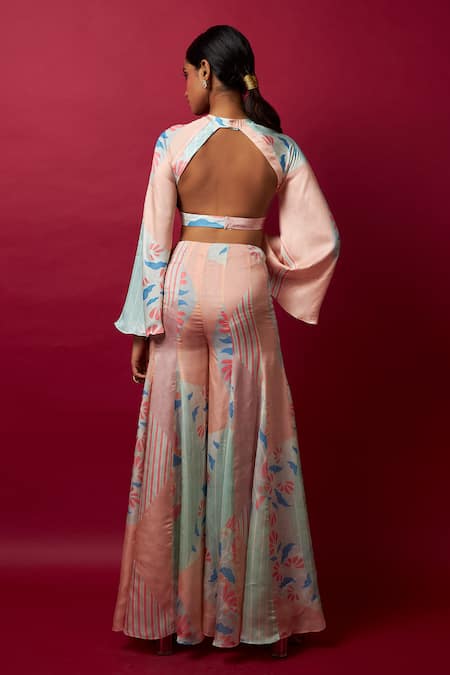 Multi color top featuring a high neck and bell sleeves with an abstract floral print. Paired with matching satin organza pants with an attached inner lining.