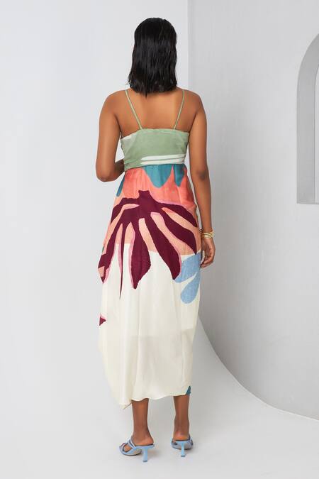 Multi Color Satin Sweetheart Neck Abstract Print Draped Dress