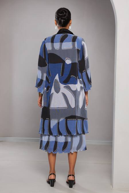 Blue midi dress featuring a round neckline and sleeveless design. Paired with a pleated jacket with a lapel collar and abstract print details.