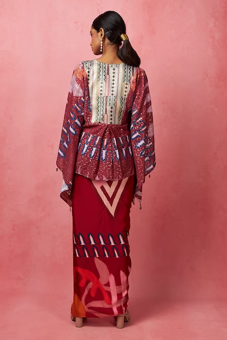 Multi color kimono top featuring a V neck, asymmetric sleeves, and sequin embellishments. Paired with a draped satin skirt showcasing an abstract print.