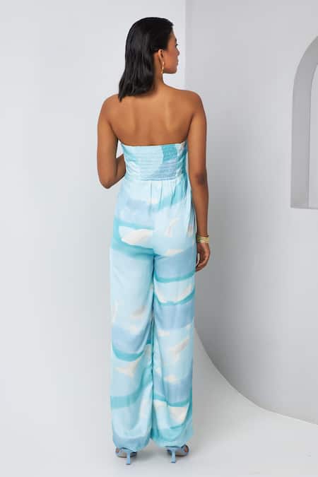 Blue strapless jumpsuit featuring an abstract print and pleated yoke