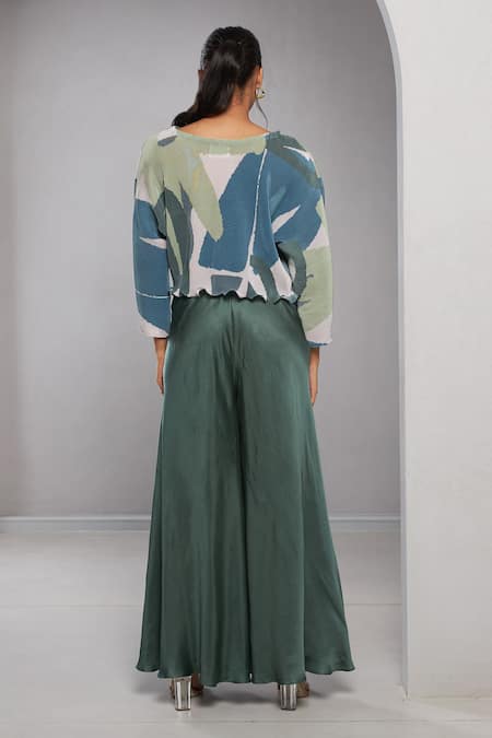 Green shaded pleated top featuring an abstract print with three quarter sleeves. Paired with bias-cut satin pants for a coordinated look.