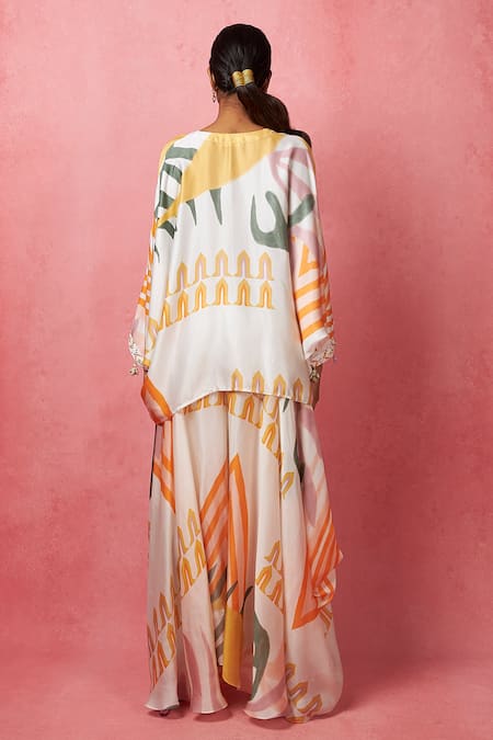 Multi color kimono top featuring a V neck, embellished panel, and flared sleeves. Paired with draped pants showcasing an abstract print.