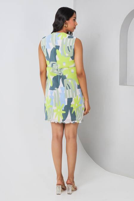 Green Satin, Chiffon Sweetheart Neck Botanical Print Pleated Dress