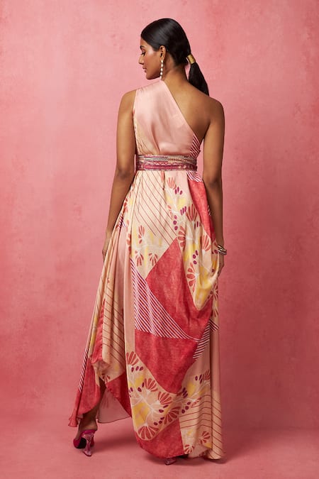 Multicolour one shoulder dress featuring abstract floral geometric prints. Comes with a corset belt for a fitted waistline.