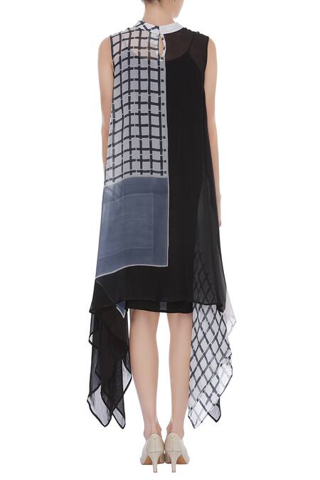 Black Pepper Silk Checkered Band Collar Printed Asymmetric Dress