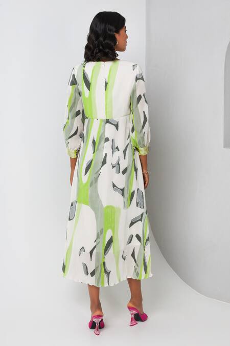 Green midi dress featuring tonal abstract printed patterns on a textured base with side cut-outs