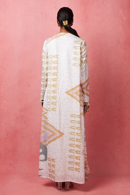 Multi color long jacket featuring abstract print and sequin embellishments. Paired with an inner bustier and pant, both adorned with similar abstract prints and sequin work.